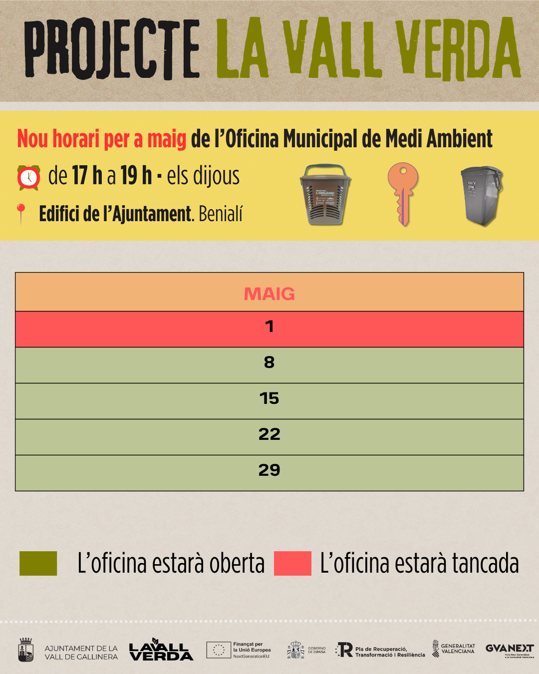 🟩 Recorda que s’ha ampliat el calendari d’atenció de l’Oficina Municipal de Medi Ambient. Tots els dijous de maig (excepte el primer) estarà oberta de 17 h a 19 h, a la planta baixa de l’Ajuntament.