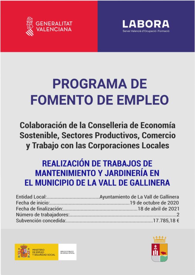 L’Ajuntament rep 17785.18€ del programa EMCORP 2020 per a contractar dos persones, desocupades d’almenys 30 anys, per a la realització d’obres o serveis d’interés.