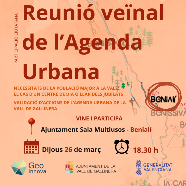 CONTINUEM AMB LES REUNIONS VEÏNALS DE L’AGENDA URBANA. EL 26 DE MARÇ A BENIALÍ 18:30H Reflexionarem sobre les necessitats de la població major. Valorarem la necessitat d’un centre de dia o llar de jubilats. Validarem accions de l’Agenda Urbana relacionades amb Benialí. VINE I PARTICIPA