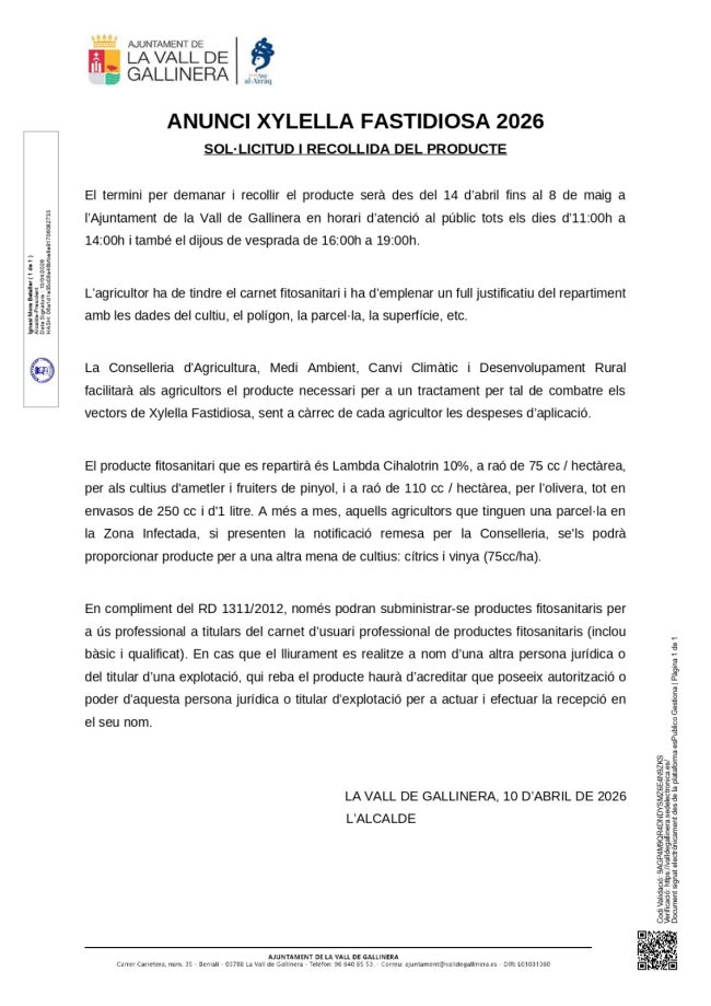 REPARTIMENT DEL PRODUCTE PER AL CONTROL DE LA XYLELLA FASTIDIOSA Aquells/es agricultors/es interessats/des en aquest tractament, podeu passar a recollir-lo a l’ajuntament a partir del dimarts 14 d’abril fins al divendres 8 de maig en horari d’atenció al públic de dilluns a divendres d’ 11.00h a 14.00h i, excepcionalment, els dijous de vesprada, de 16:00h…