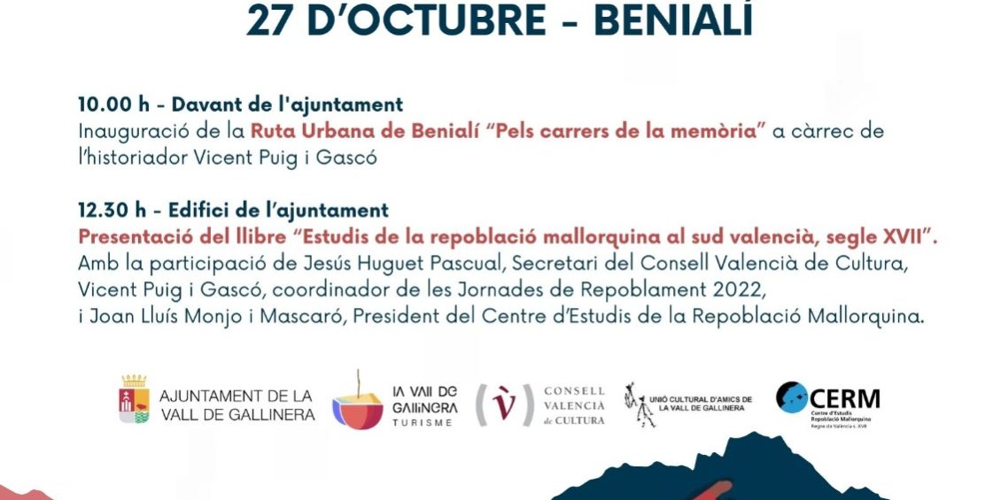 El manuscrit, “Estudis de la repoblació mallorquina al sud valencià, segle XVII”, serà presentat aquest diumenge 27 d’octubre a les 12.30 h a l’edifici de l’ajuntament, situat a Benialí, i comptarà amb la participació de Jesús Huguet Pascual, Secretari del Consell Valencià de Cultura, Vicent Puig i Gascó, coordinador de les Jornades de Repoblament de 2022, i Joan Lluís Monjo i Mascaró, President del Centre d’Estudis de la Repoblació Mallorquina.