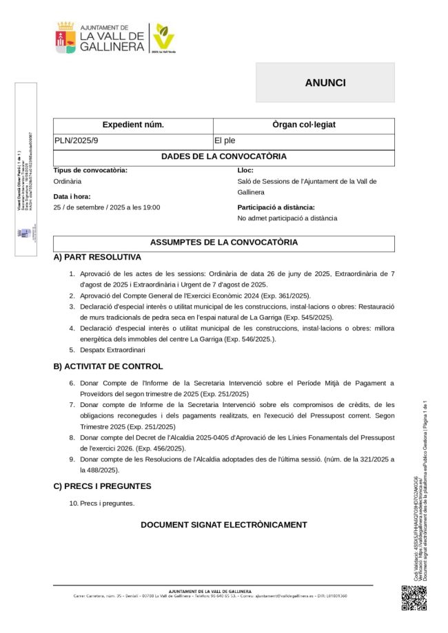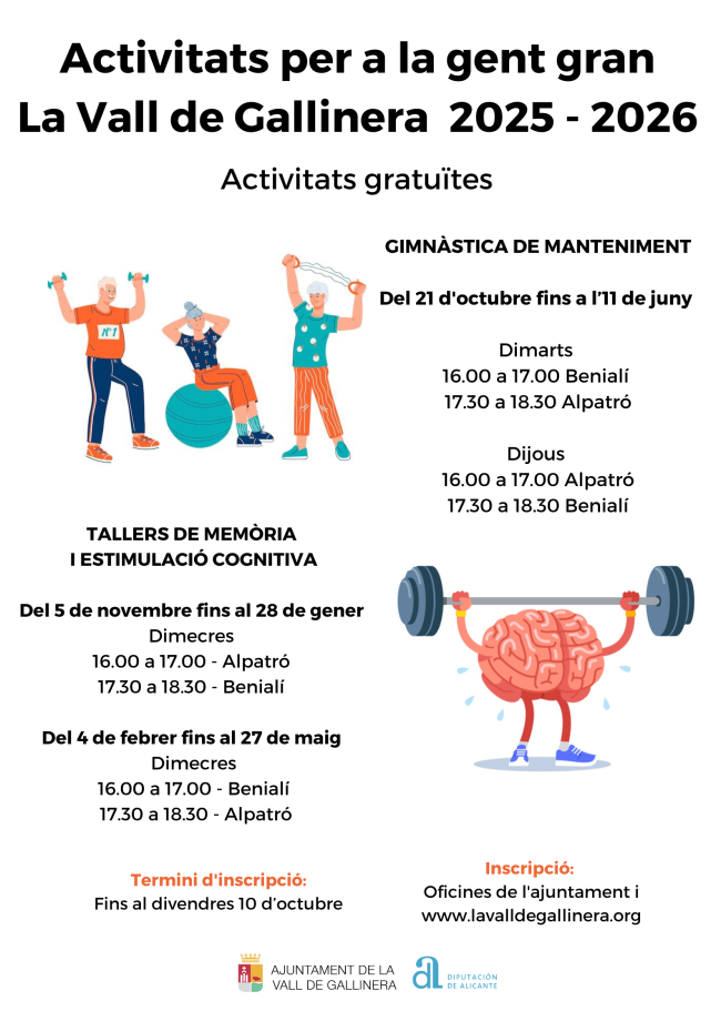 Inscripció a les activitats per a la gent gran de la Vall de Gallinera 2025-2026 ➡️ Inscripció fins al divendres 10 d’octubre. ➡️ Si vols apuntar-te a les dues activitats, has d’emplenar el formulari que trobaràs al final per a cada activitat per separat. 👉GIMNÀSTICA DE MANTENIMENT Des del 21 d’octubre fins a l’11 de…