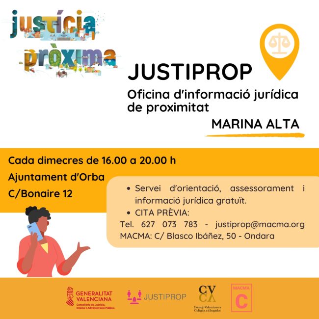 JUSTIPROP – Oficina d’informació jurídica de proximitat de la Marina Alta La Mancomunitat Comarcal de la Marina Alta – MACMA amb la Conselleria De Justícia, gràcies a la col·laboració de l’Ajuntament d’Orba que ha cedit un espai en el nou Ajuntament, obri un nou servei anomenat JUSTIPROP. Es tracta d’un servei de justícia de proximitat…
