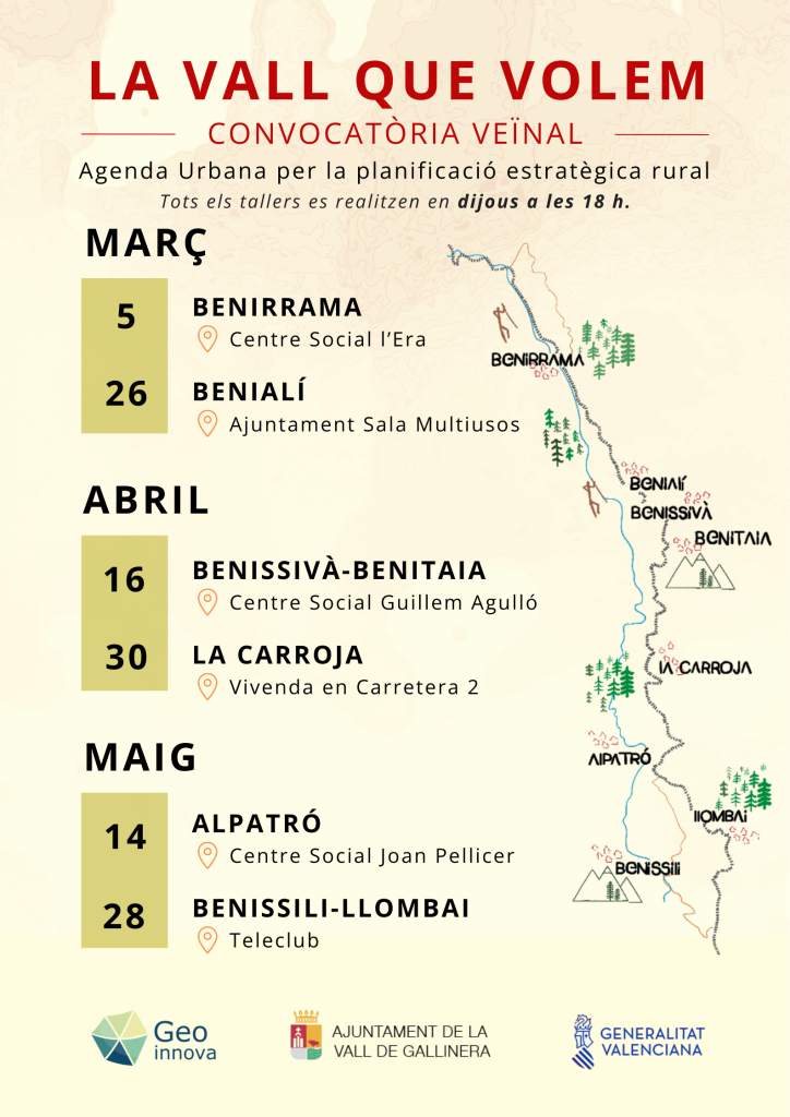 El proper dijous 5 de març a les 18h a Benirrama farem un retorn de l’Agenda Urbana que estem treballant i ens endinsarem en les necessitats de la Vall amb un taller sobre l’aparcament per buscar solucions compartides amb el veïnat.