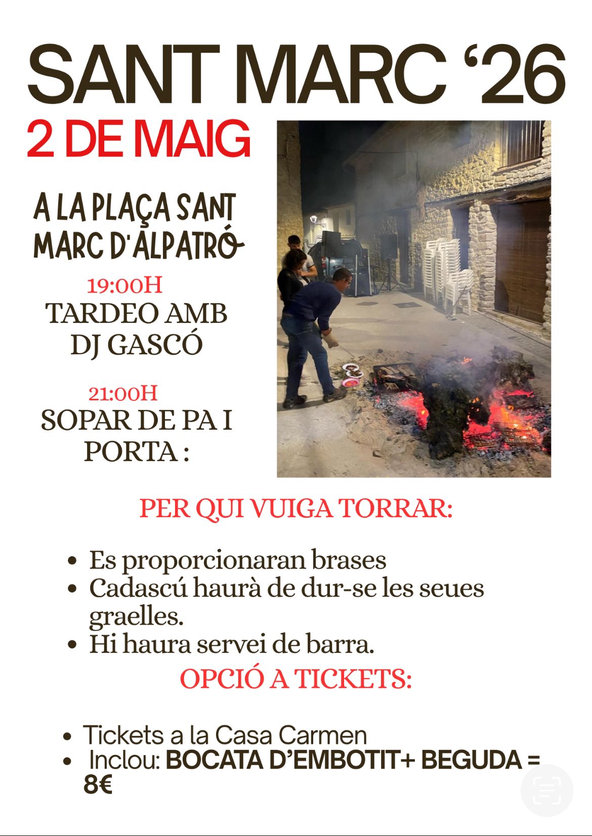 Home Eventos FESTA SANT MARC 2026 ALPATRÓ 2 DE MAIG FESTA SANT MARC 2026 ALPATRÓ 2 DE MAIG + Add to Google Calendar + iCal / Outlook export 00 days 00 hours 00 minutes 00 seconds Date May 02 2026 Time 19:00 - 23:00 Share this event