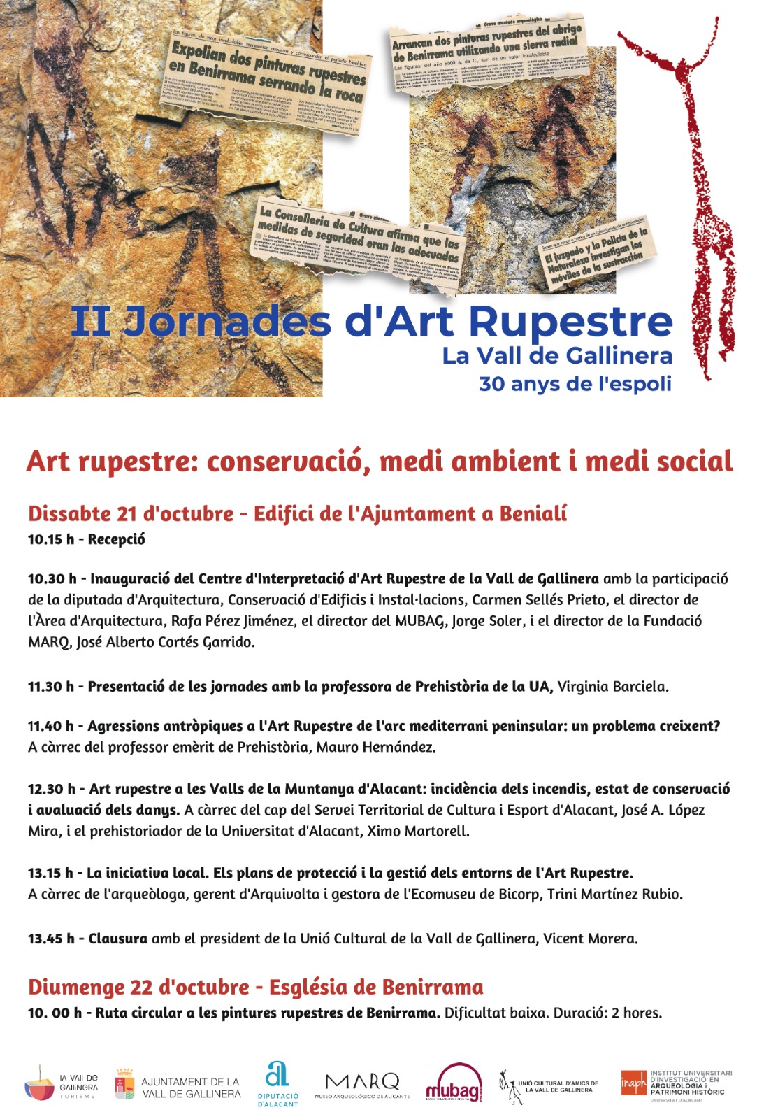 Home Eventos II Jornades d’Art Rupestre a la Vall de Gallinera II Jornades d’Art Rupestre a la Vall de Gallinera + Add to Google Calendar + iCal / Outlook export The event is finished. Date oct. 21 - 22 2023 Expired! Time 10:00 - 12:00 Share this event