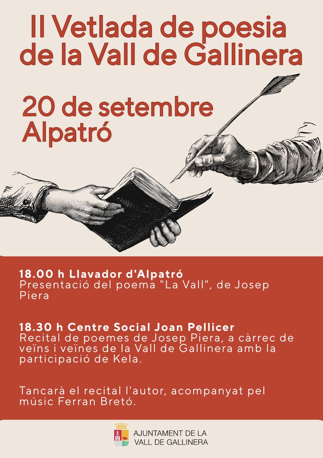 Home Eventos II Velada de poesía de la Vall de Gallinera II Velada de poesía de la Vall de Gallinera + Add to Google Calendar + iCal / Outlook export The event is finished. Date set. 20 2025 Expired! Time 18:00 - 19:00 Share this event