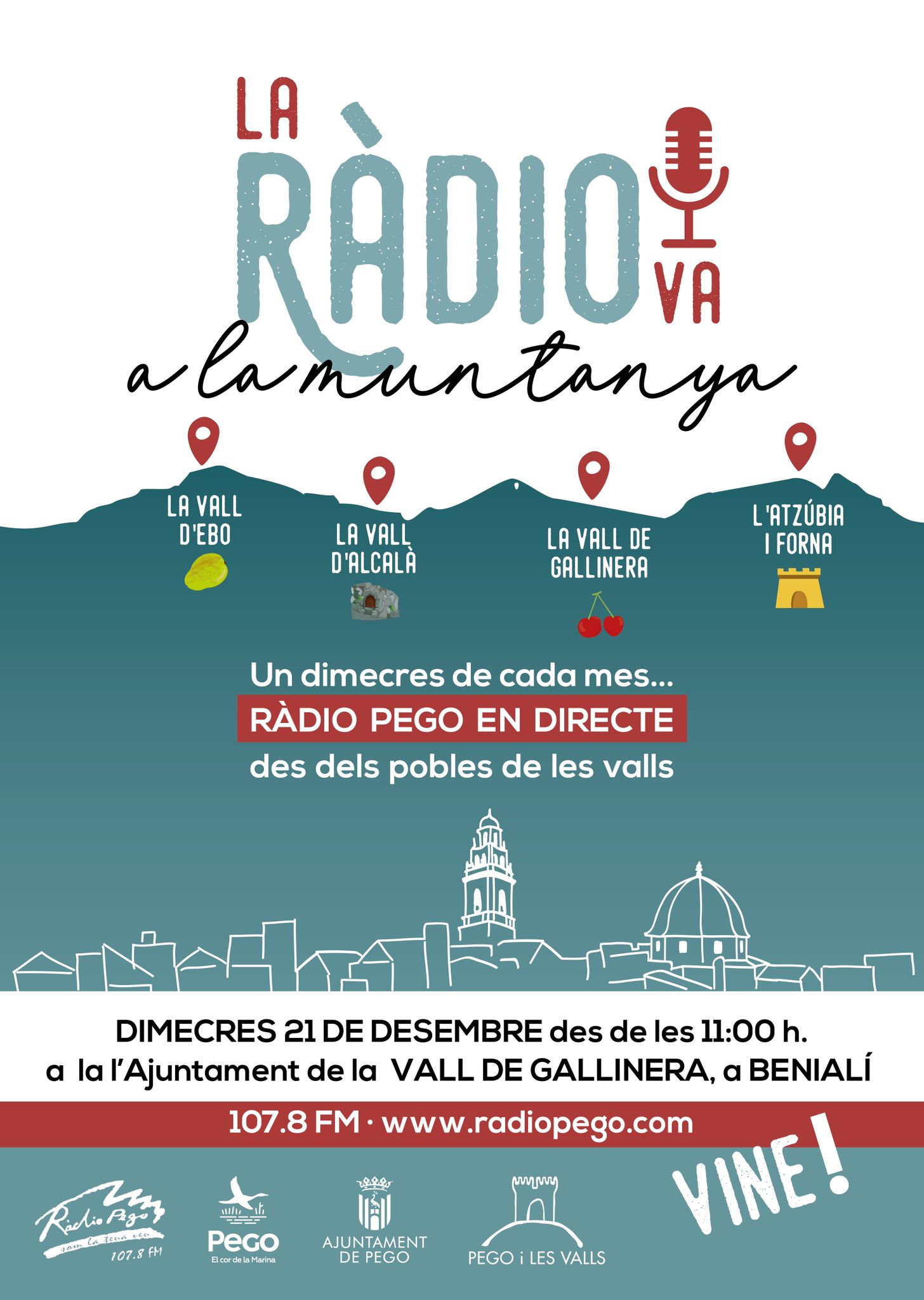 Home Eventos LA RÀDIO VA A LA MUNTANYA LA RÀDIO VA A LA MUNTANYA Un dimecres de cada mes, RÀDIO PEGO EN DIRECTE des dels pobles de les valls. DIMECRES 21 DE DESEMRE des de les 11:00h a l’Ajuntament de la Vall de Gallinera. + Add to Google Calendar + iCal / Outlook export The event is finished. Date des. 21 2022 Expired! Time 11:00 - 15:00 Share this event