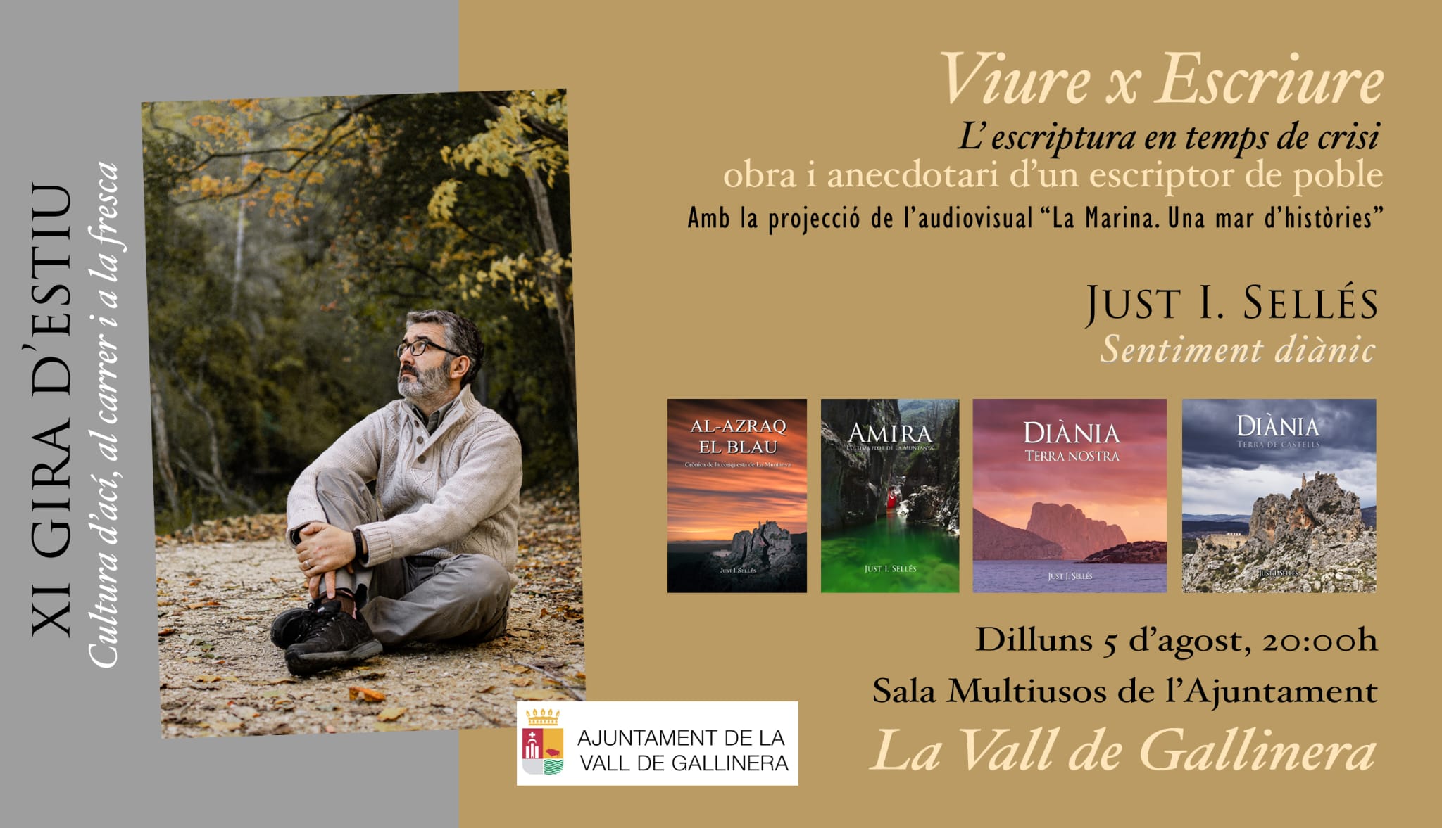 El proper dilluns 5 d’agost a les 20h a la Sala Multiusos de l’Ajuntament de la Vall de Gallinera es presentarà “Viure x Escriure. L’escriptura en temps de crisi. Obra i anecdotari d’un escriptor de poble” de Just I. Sellés. Amb la projecció de l’audiovisual “La Marina. Una mar d’històries”.