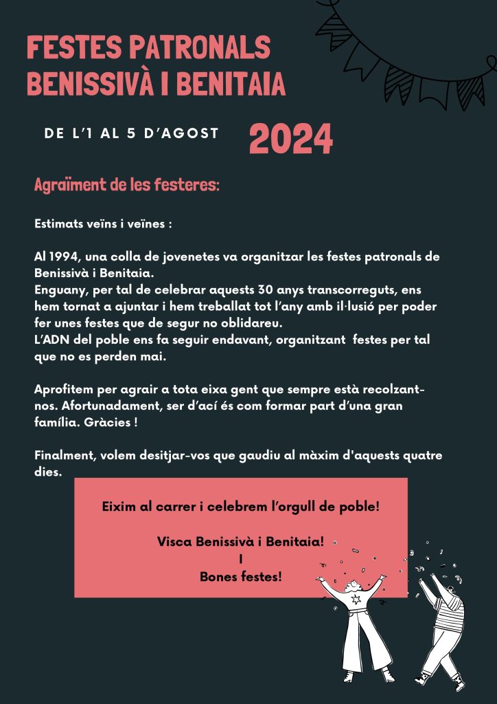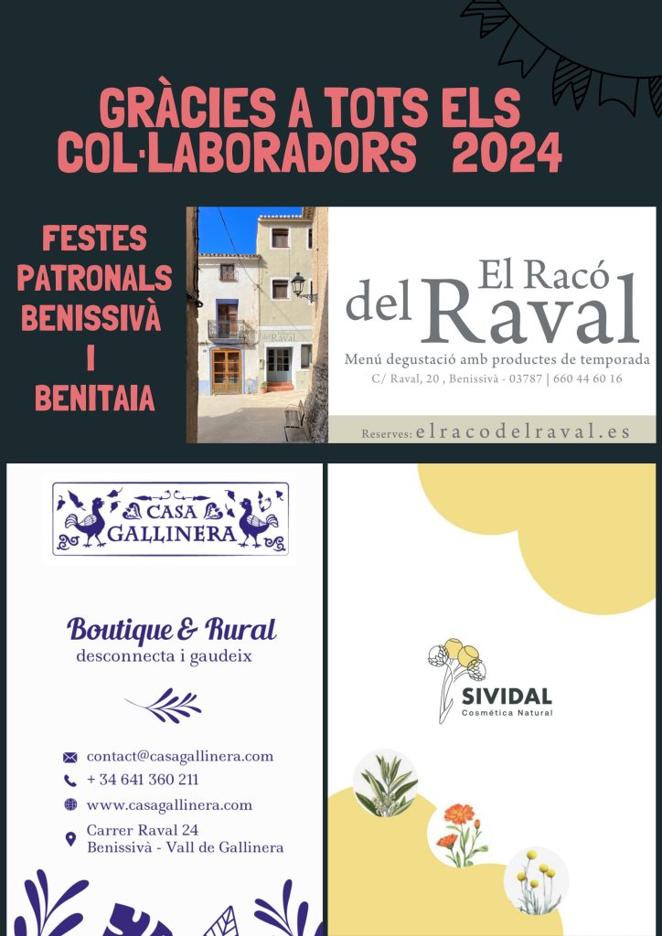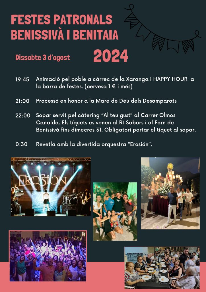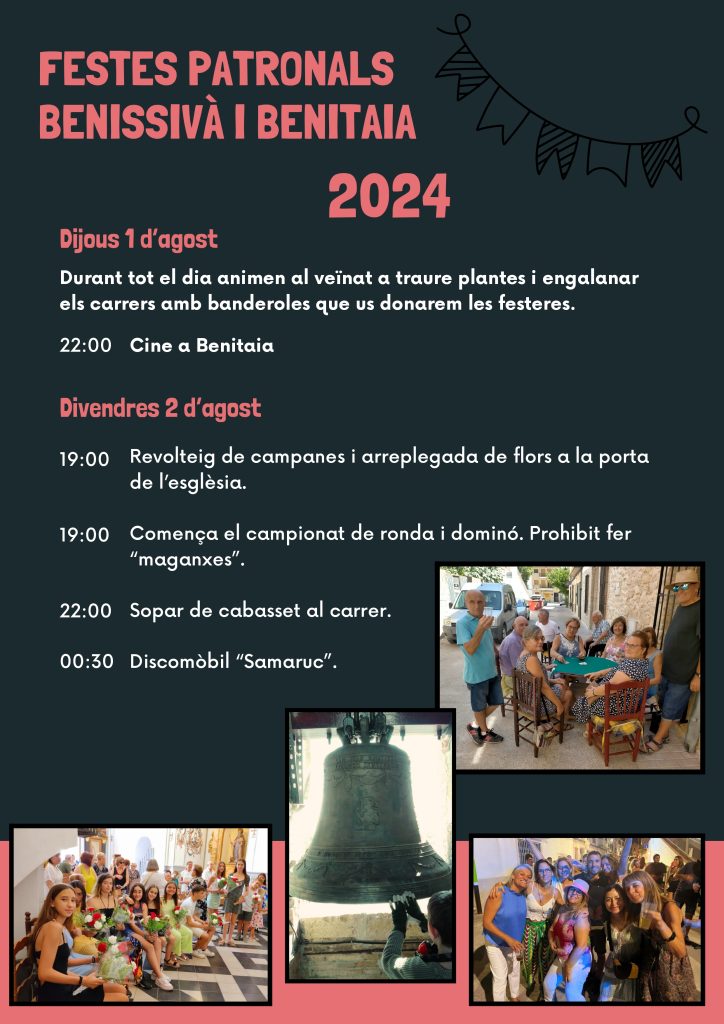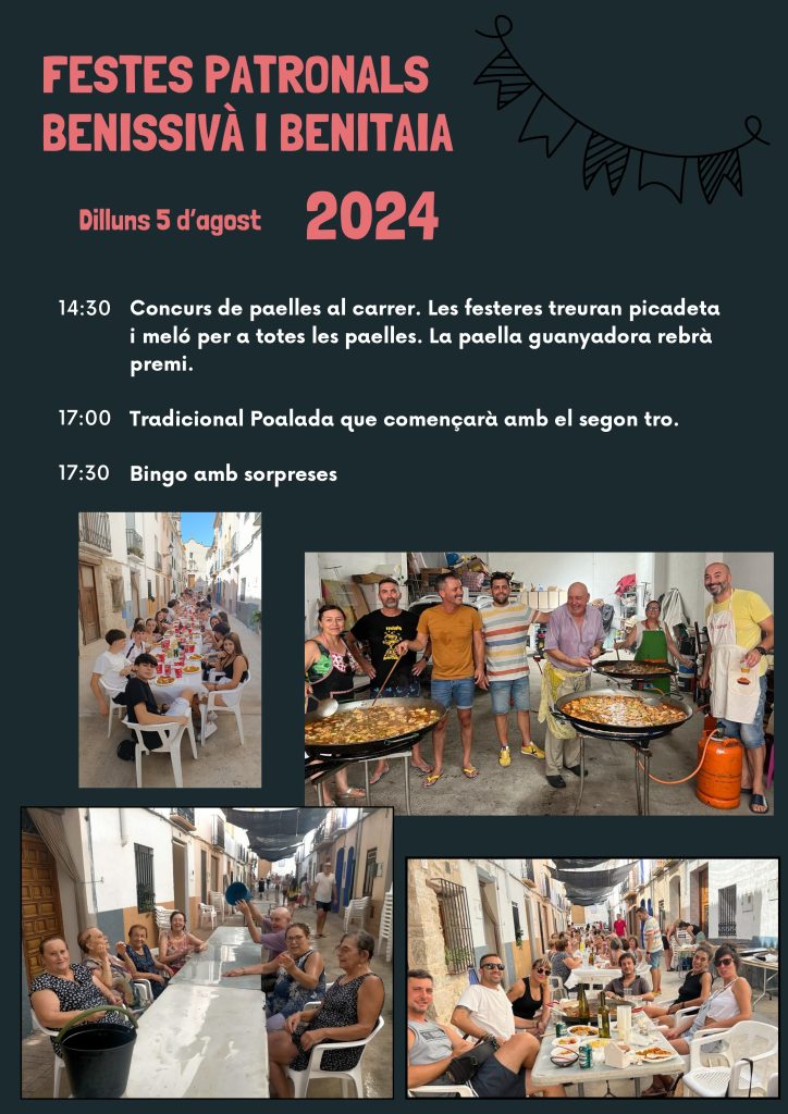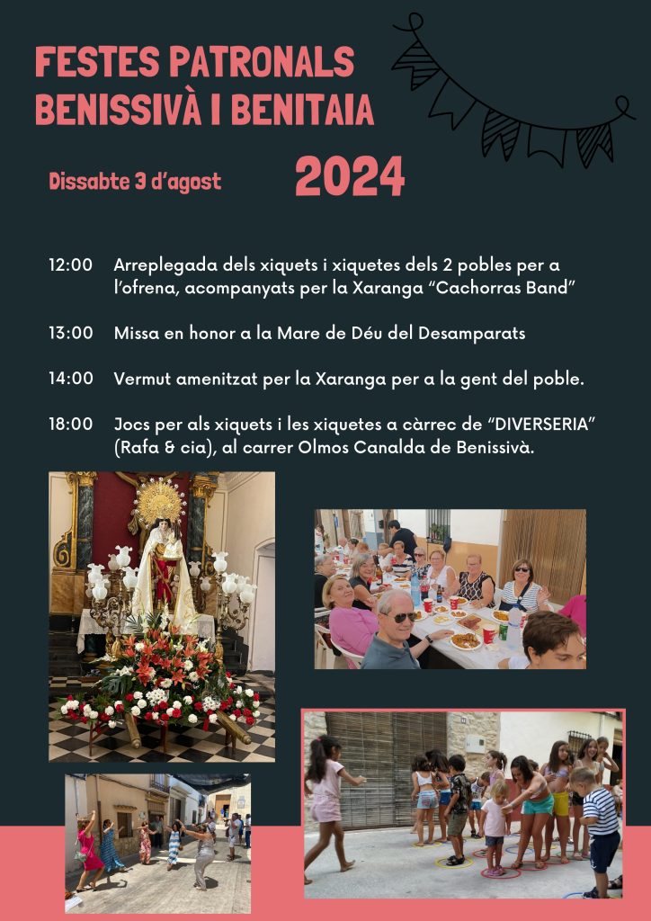 Home Eventos PROGRAMACIÓ DE FESTES PATRONALS DE BENISSIVÀ I BENITAIA 2024 PROGRAMACIÓ DE FESTES PATRONALS DE BENISSIVÀ I BENITAIA 2024 PROGRAMACIÓ DE FESTES PATRONALS DE BENISSIVÀ I BENITAIA 2024 + Add to Google Calendar + iCal / Outlook export The event is finished. Date ag. 01 - 05 2024 Expired! Time 08:00 - 23:00 Share this event