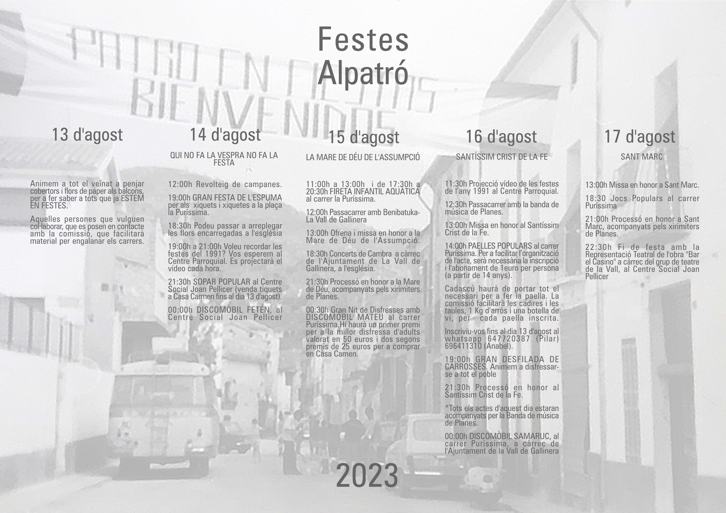Home Eventos PROGRAMACIÓ FESTES ALPATRÓ 2023 PROGRAMACIÓ FESTES ALPATRÓ 2023 + Add to Google Calendar + iCal / Outlook export The event is finished. Date ag. 13 - 17 2023 Expired! Time 08:00 - 00:30 Share this event