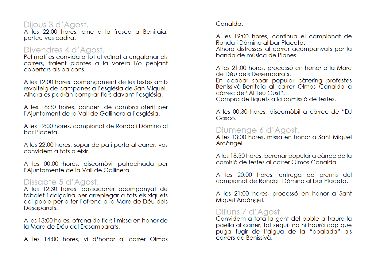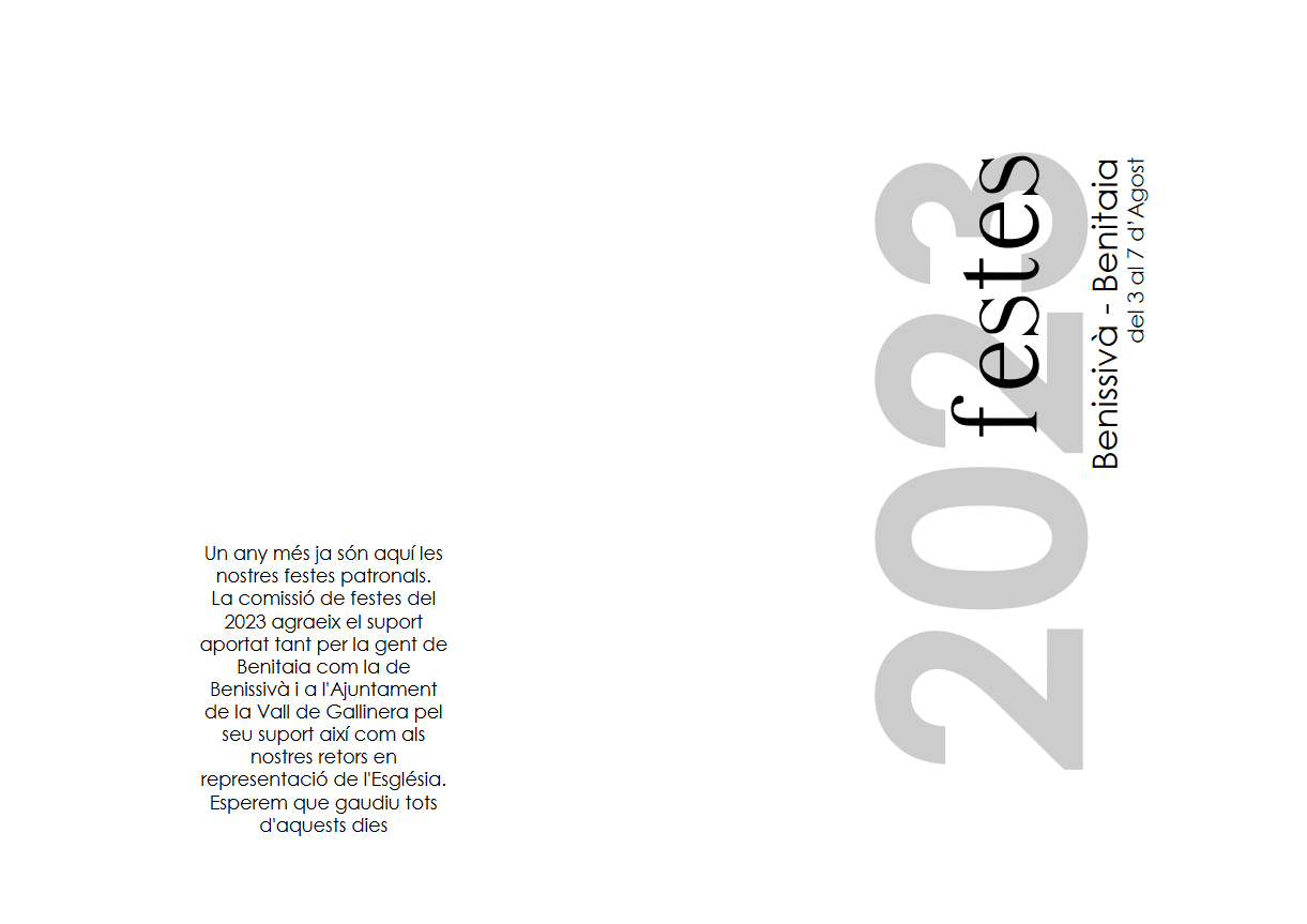 Home Eventos PROGRAMACIÓ FESTES BENISSIVÀ I BENITAIA 2023 PROGRAMACIÓ FESTES BENISSIVÀ I BENITAIA 2023 + Add to Google Calendar + iCal / Outlook export The event is finished. Date ag. 03 - 07 2023 Expired! Time 10:00 - 16:00 Share this event