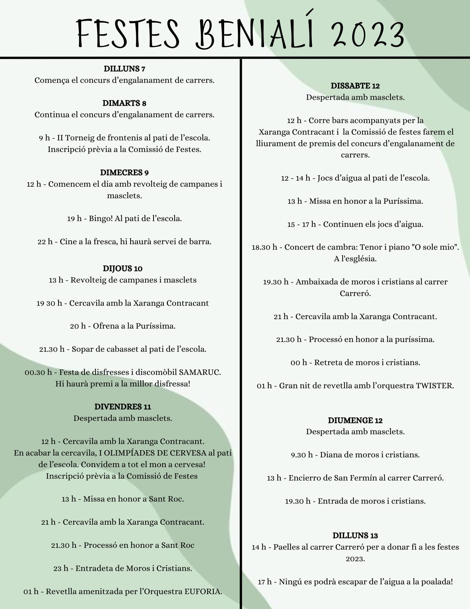 Home Eventos PROGRAMACIÓN FIESTAS BENIALÍ 2023 PROGRAMACIÓN FIESTAS BENIALÍ 2023 + Add to Google Calendar + iCal / Outlook export The event is finished. Date ag. 07 - 14 2023 Expired! Time 08:00 - 19:00 Share this event