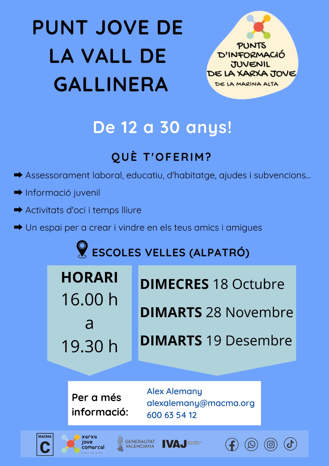 Home Eventos PUNT JOVE DE LA VALL DE GALLINERA PUNT JOVE DE LA VALL DE GALLINERA + Add to Google Calendar + iCal / Outlook export The event is finished. Date oct. 18 2023 - des. 19 2023 Expired! Time 16:00 - 19:30 Share this event