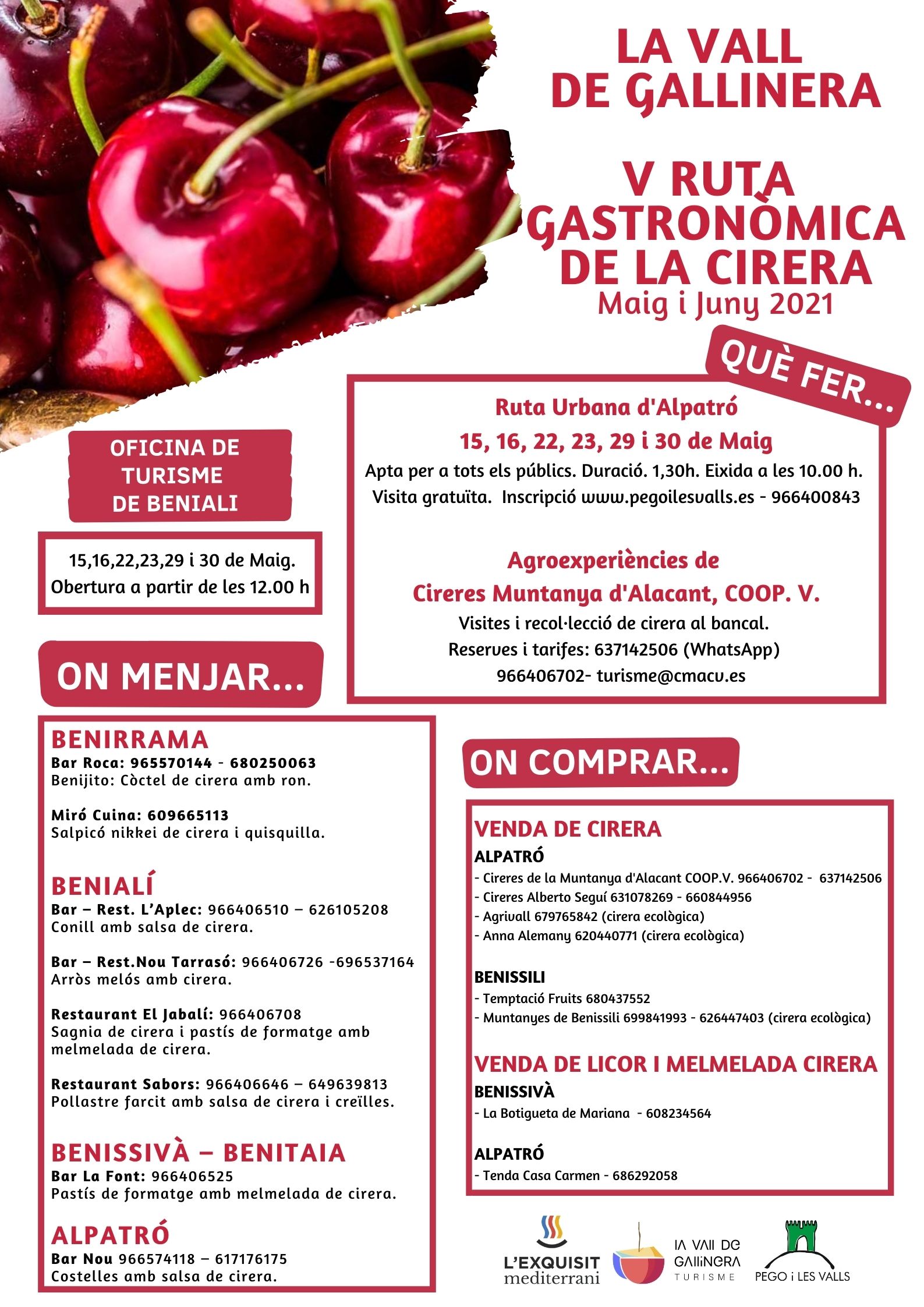 Home Eventos V Ruta Gastronòmica de la Cirera V Ruta Gastronòmica de la Cirera + Add to Google Calendar + iCal / Outlook export The event is finished. Date maig 22 2021 - juny 14 2021 Expired! Time All Day Share this event