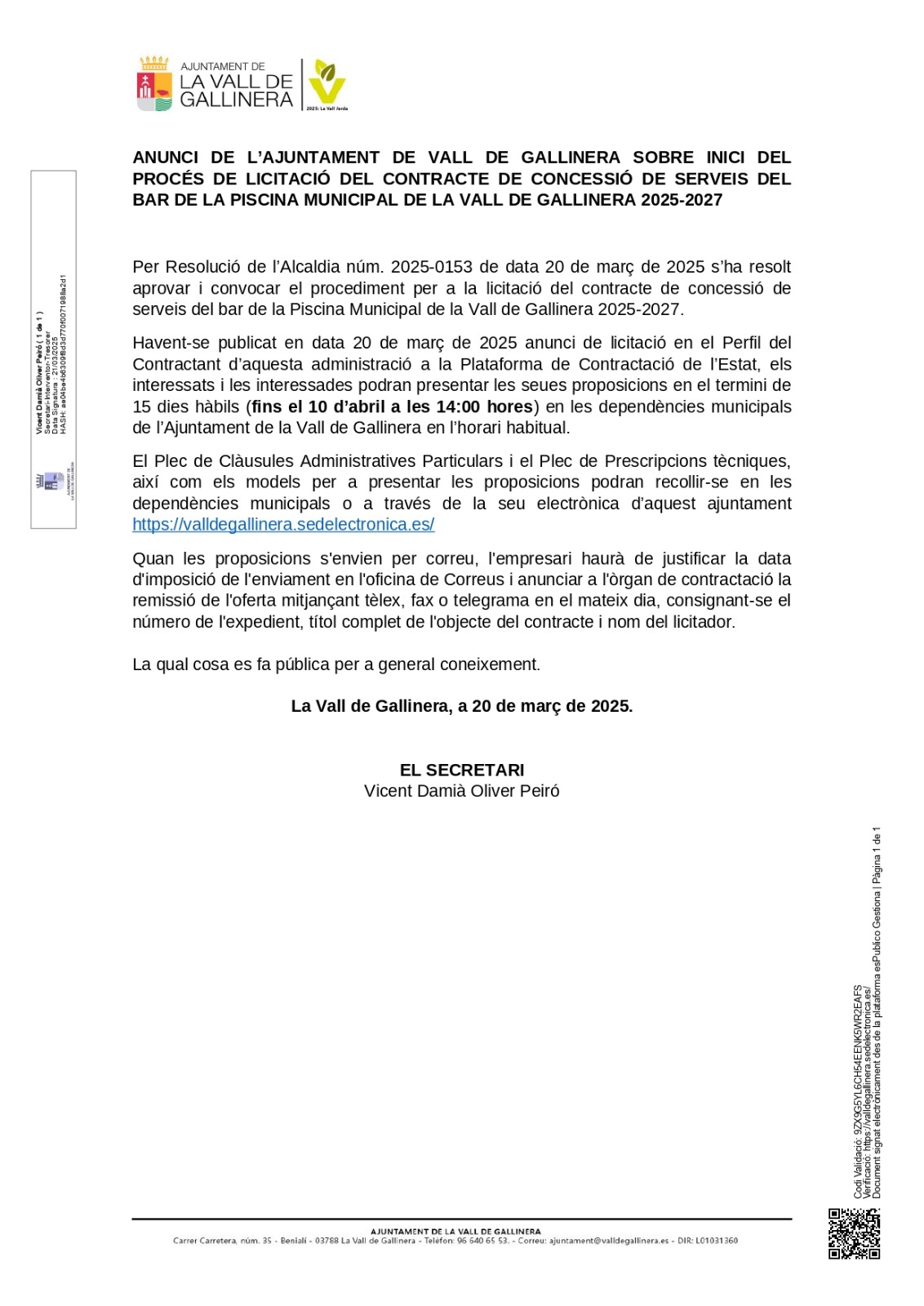 març212025Ban municipal Enllaç seu electrònica: https://valldegallinera.sedelectronica.es Category: Ban municipal21 març 2025Post navigationPreviousPrevious post:La Vall Verda: materiales pera los negociosNextNext post:Inicio del proceso de licitación del contrato de concesión de servicios del bar de la piscina municipal 2025-2027