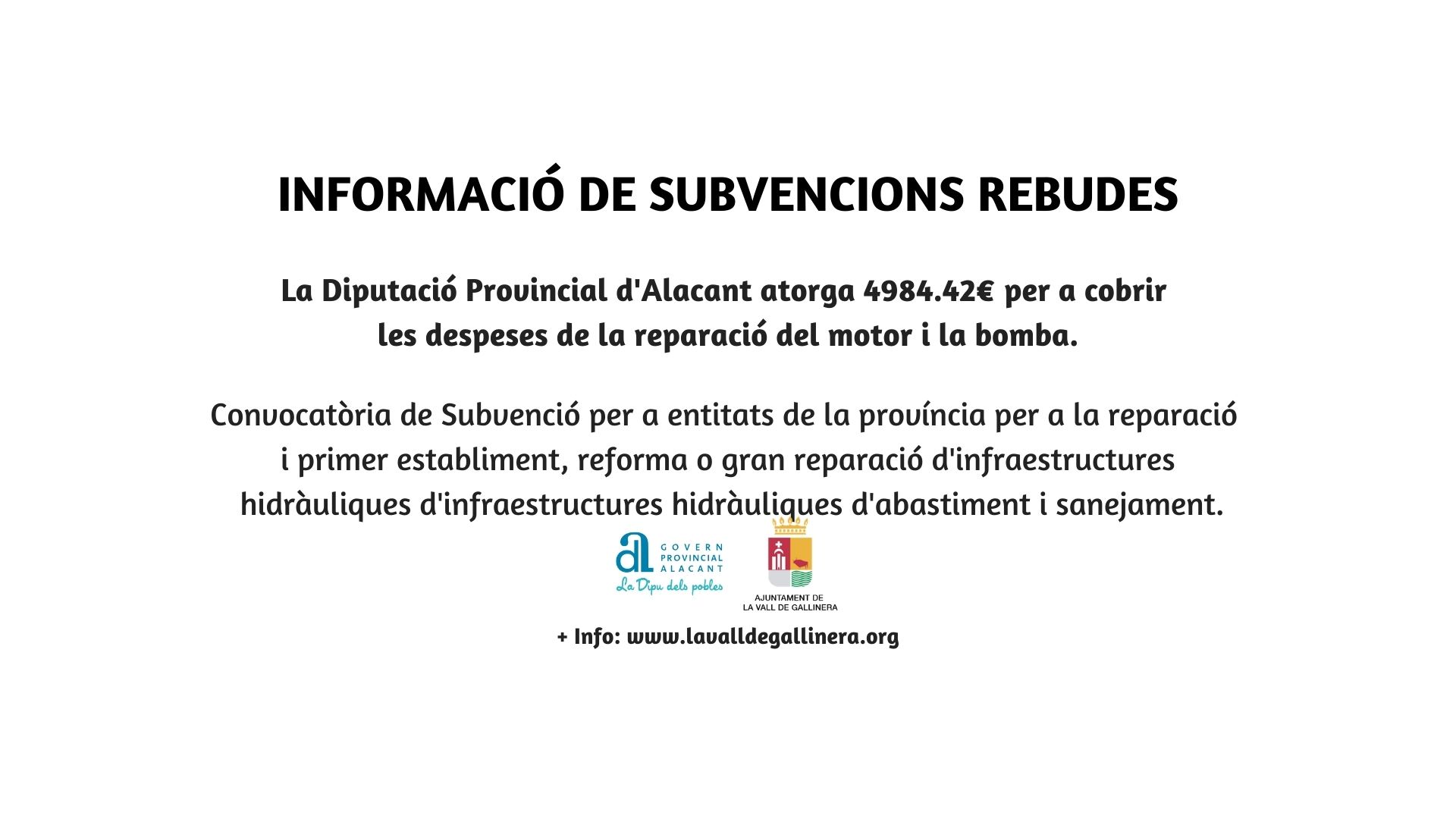 Informació Category: Subvencions rebudes12 novembre 2020Post navigationPreviousPrevious post:La Diputació Provincial d’Alacant atorga 5000€ per a cobrir les despeses de les obres de millora del Camí dels CepsNextNext post:L’Ajuntament rep 17785.18€ del programa EMCORP 2020 per a contractar dos persones, desocupades d’almenys 30 anys, per a la realització d’obres o serveis d’interés.