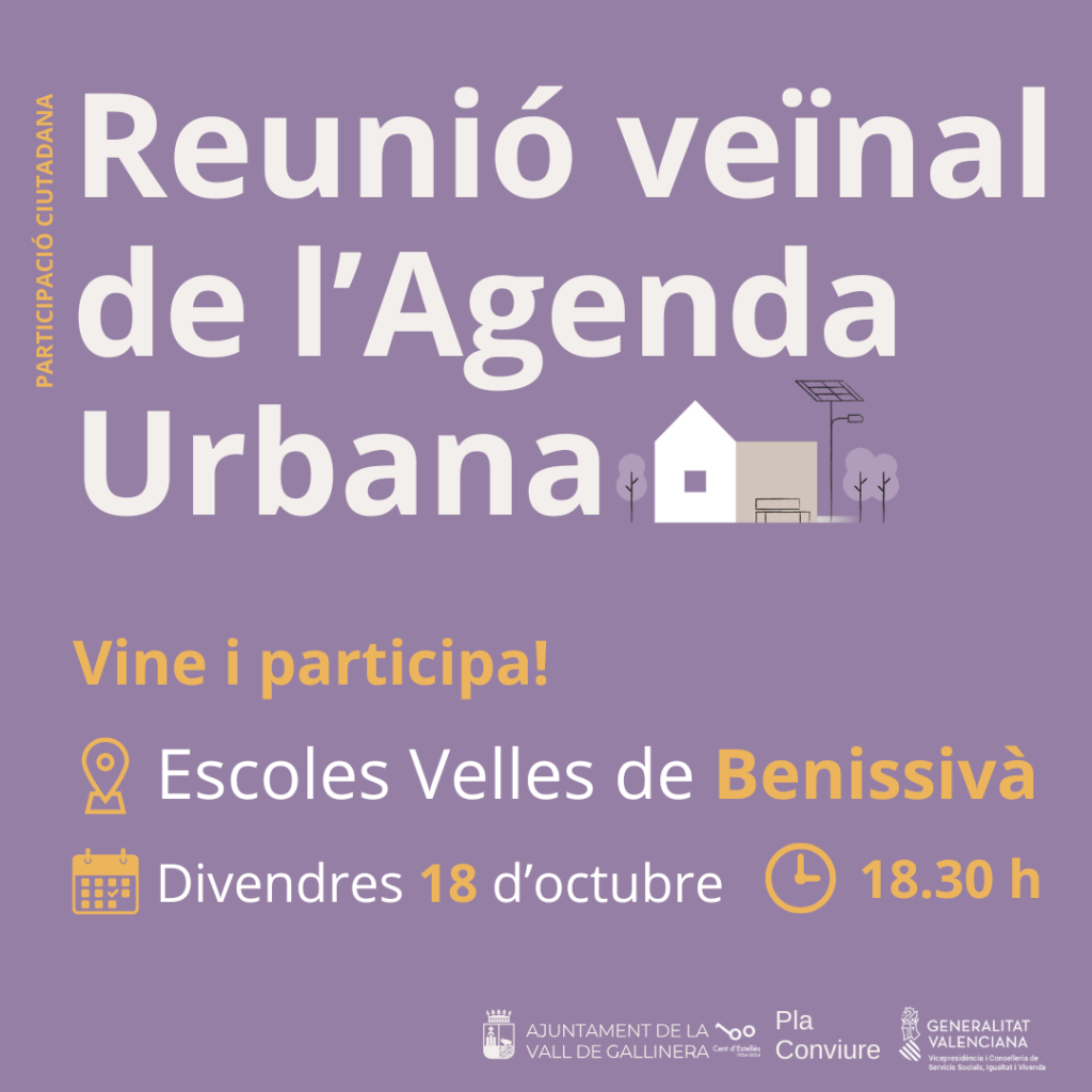 – Dentro de un calendario de reuniones en todos los núcleos urbanos, la próxima cita será este viernes 18 a las 18:30 h en las Escuelas Viejas de Benissivà para presentar la Agenda Urbana y las obras del Plan Conviure