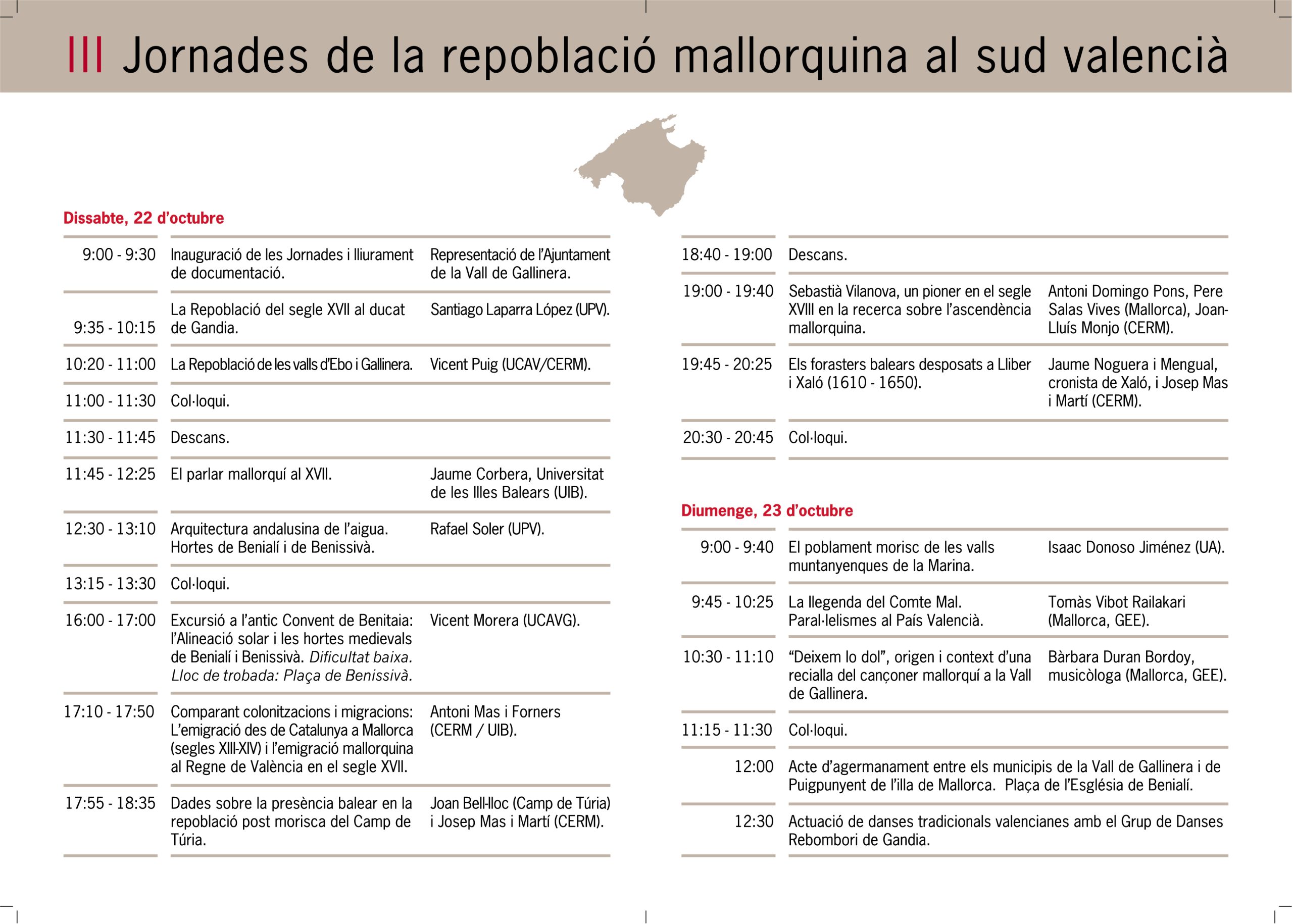 En les III Jornades del Repoblament Mallorquí al sud Valencià, seguim la mateixa tradició, aporten un intercanvi de investigadors i investigadores mallorquines i valencianes, seguim la mateixa estructura vertebradora de les Jornades i incorporem nous elements de interdisciplinarietat com són la musicología, les llegendes, així com dades sobre la presència balear en el Camp de Túria.