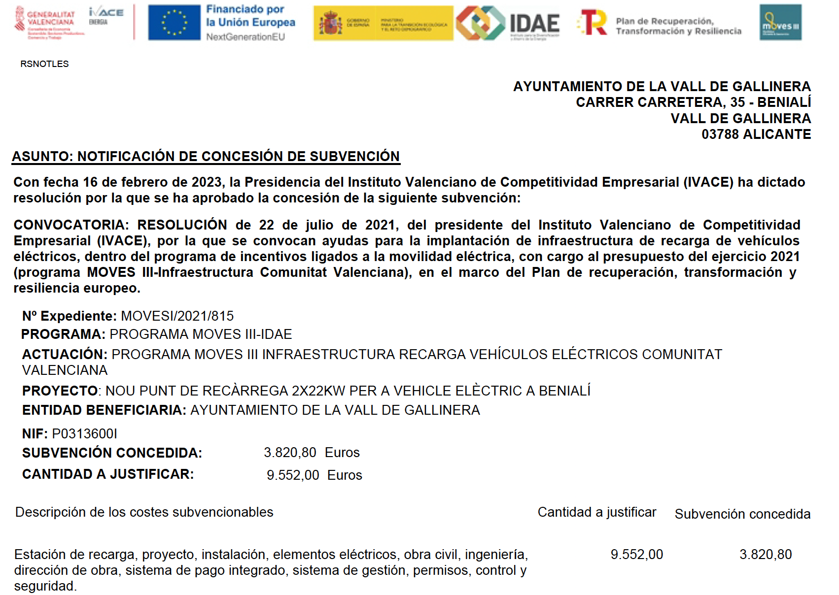 L’IVACE atorga 3.820,80 € a l’Ajuntament per la implantació d’infraestructura de recàrrega de vehicles elèctrics