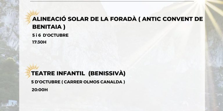 Entrar en octubre significa gaudir de l’Alineació Solar de la penya més emblemàtica de la Vall de Gallinera, La Foradà. Gràcies a l’estudi que va realitzar el Dr. José Lull, l’alineació solar de la Foradà ha estat demostrada i comprovada científicament. En alguns llibres es contava que existia una tradició que deia que el dia…