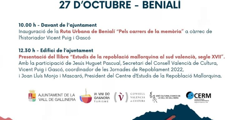 Actes diumenge 27 d’octubre Benialí 📍 10.00 h – Inauguració de la Ruta Urbana de Benialí, Pels Carrers de la Memòria 📍 12.30 h – Presentació del llibre de la “Estudis de la repoblació mallorquina al sud valencià, segle XVII” ————– El passat 2022 tingué lloc l’agermanament entre Puigpunyent i la Vall de Gallinera amb…