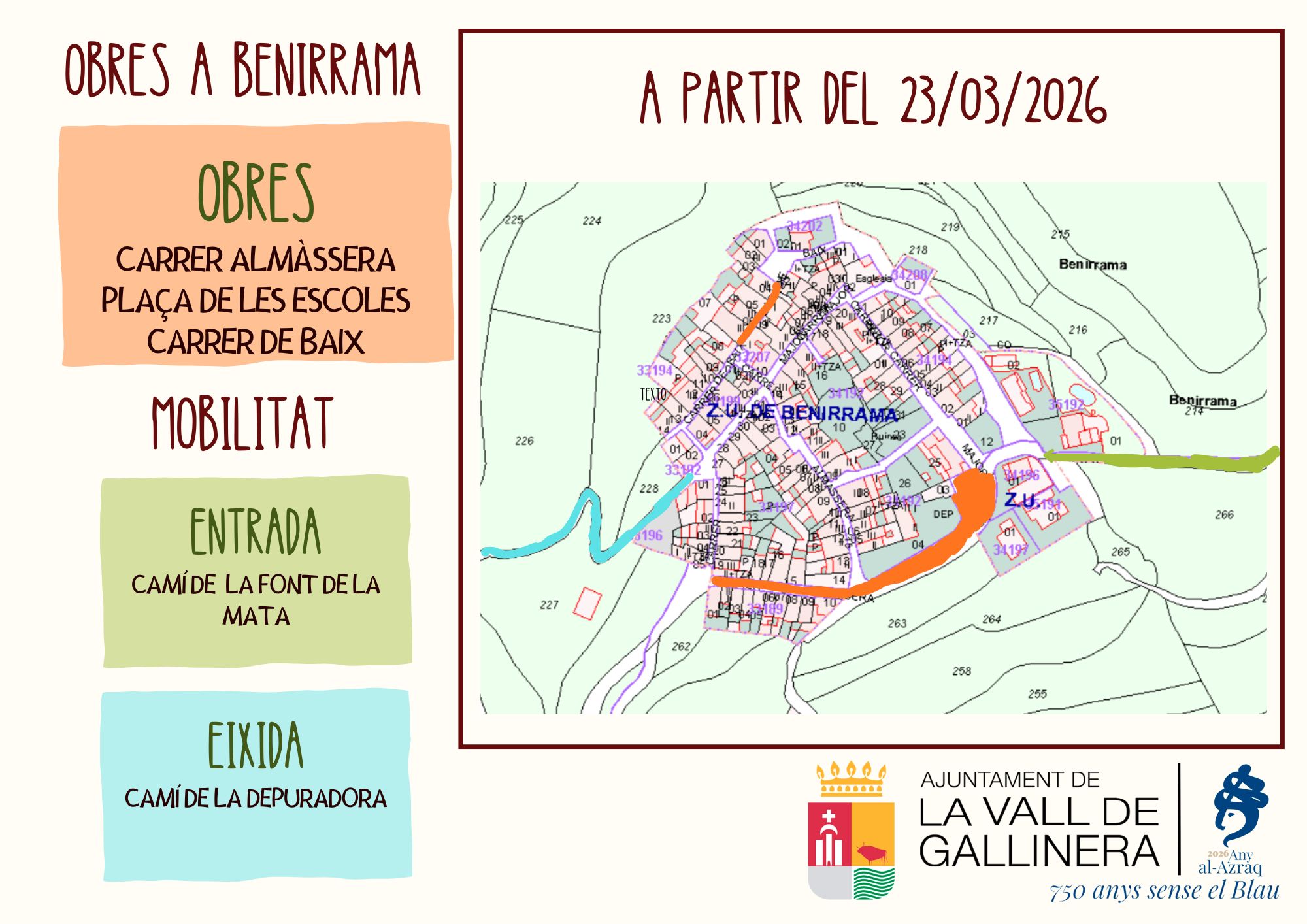 S’informa que el dilluns 23 de març s’inicien les obres del C/Almàssera, part del C/Baix i la plaça de les escoles. Tindran una durada d’uns 3 mesos aproximadament.