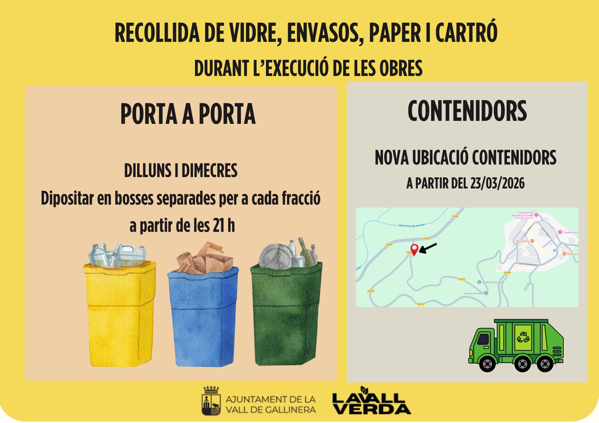 La recollida del fem es farà porta a porta de totes les fraccions i a banda a l’eixida del camí de la depuradora hi haurà els contenidors d’envasos, de paper/cartró, de vidre i d’oli, ja que els camions no poden pegar la volta al poble.